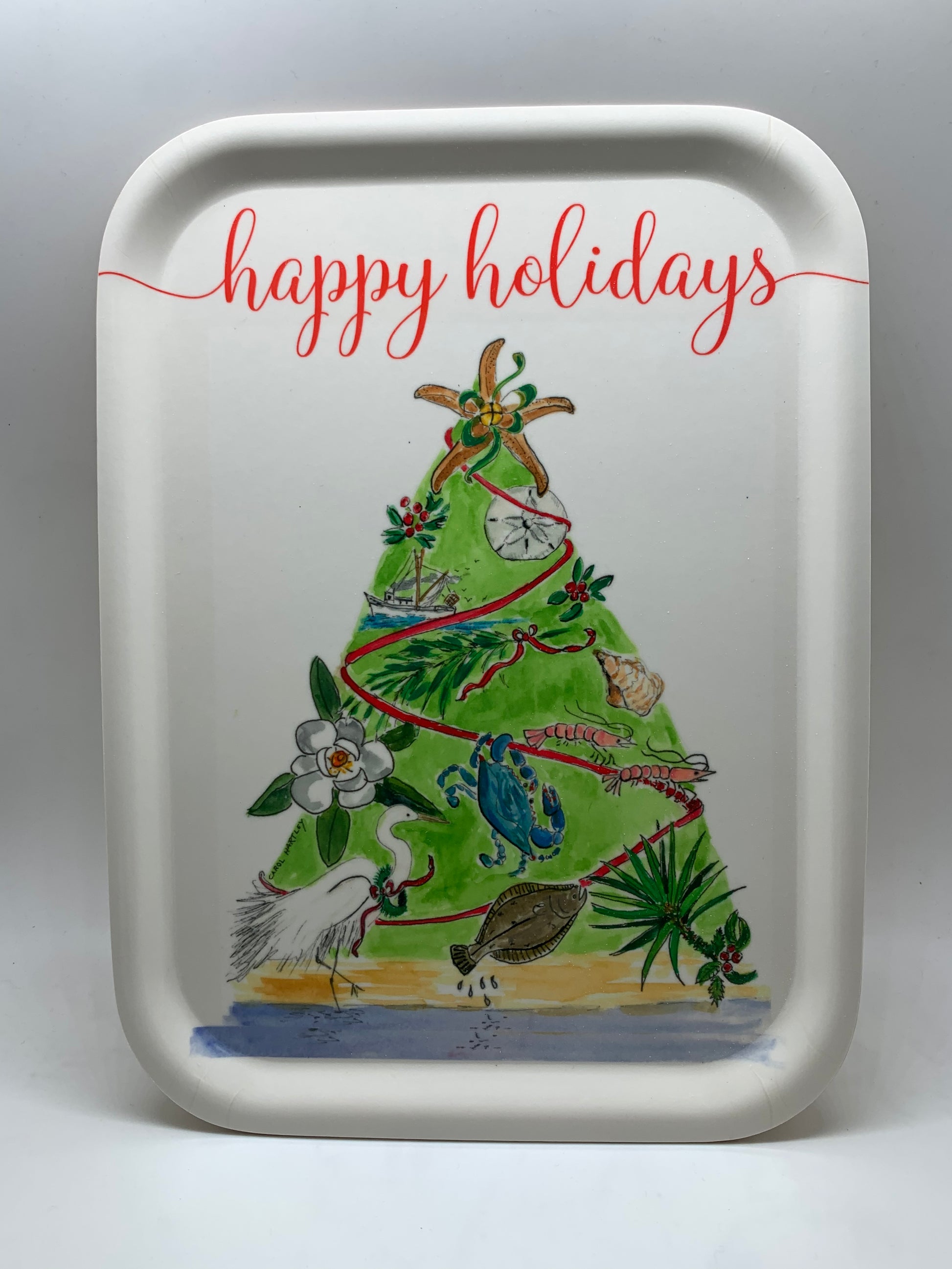 Holiday hostess gift! Birch tray measures 8”x10.5” with a custom coastal tree watercolor image by artist Carol Hartley. Theses are great for cookies, charcuterie, jewelry, parfumerie, electronics or that cute pop on a bookshelf.