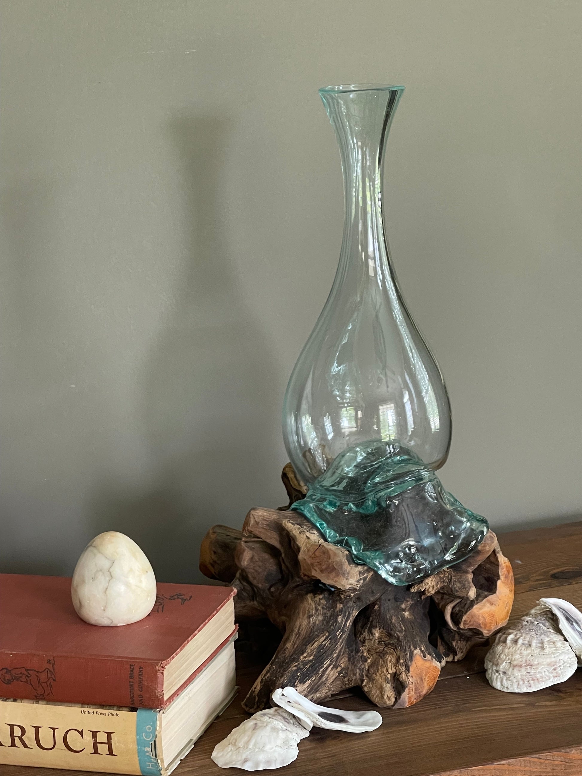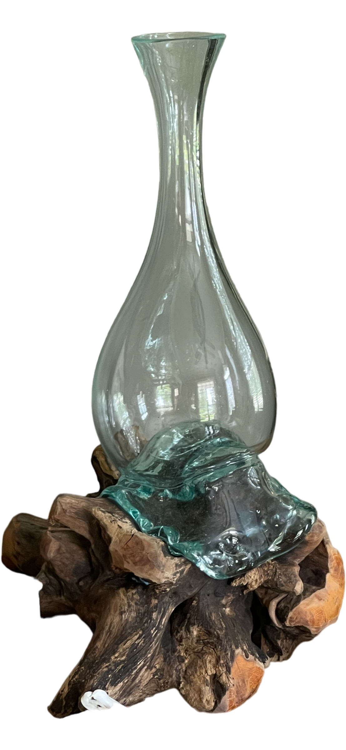 This unique vase combines the best of coastal decor; Driftwood and Sea Glass that is hand blown to look as if it is melting over the beautiful driftwood base. Measures approximately 9.5"H x 6" wide.