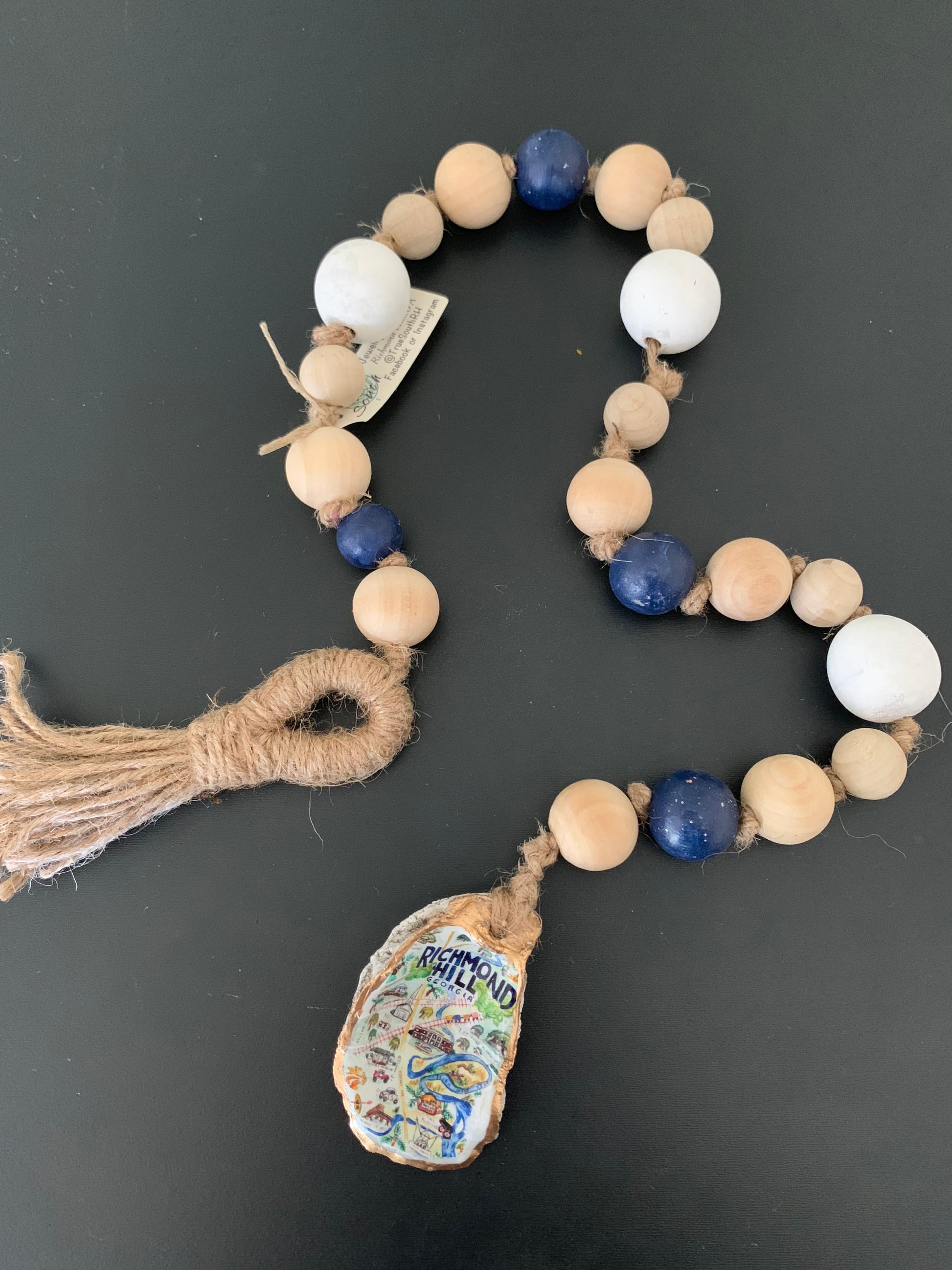 Welcome beads are a strand of wooden beads with colored accents, jute twine tassel, and of course an oyster shell. They are great for hostess gifts, baby, housewarming or to decorate your coffee table or bookshelf. Our strands measure approximately 28’35’ from tassel to shell. We can create a custom color combination for you. Custom orders can take 7-10 business days to complete.